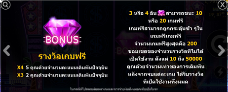 ซึ่งเงื่อนไข คือต้องได้รับเพชรสีม่วง 3 อัน และ 4 อันพร้อมกันในหนึ่งหน้าสล็อตเท่านั้น ถึงจะได้รับฟรีสปินอยู่ที่ 2 ครั้ง และ 5 ครั้งตามลำดับ